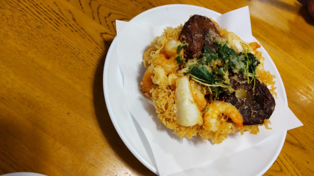 蕎麦は皮をとった更科蕎麦で、てんぷらはむきエビ、イカ、シイタケと三つ葉のかき揚げです。